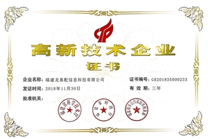 喜讯!近日,在现已公布的2018年首批认定的高新技术企业中,福建龙易配信息科技有限公司(证书编号:GR201835000233)正式拿到了国家高新技术企业认证证...