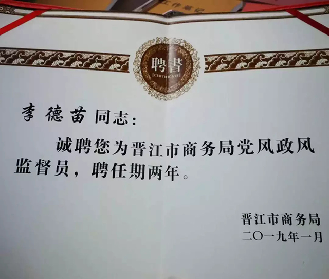 此次会议上,我司执行董事.总裁李德苗受聘为晋江市商务局党风廉政监督员,聘任期两年。在此感谢市商务局各位领导及同仁的肯定及支持。