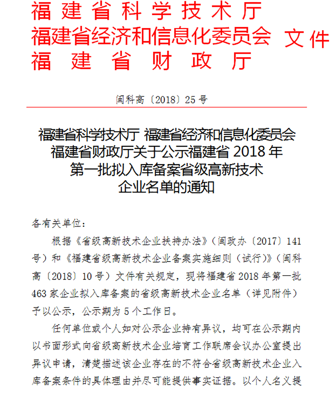 图为:福建省2018年第一批认定国家高新技术企业通知