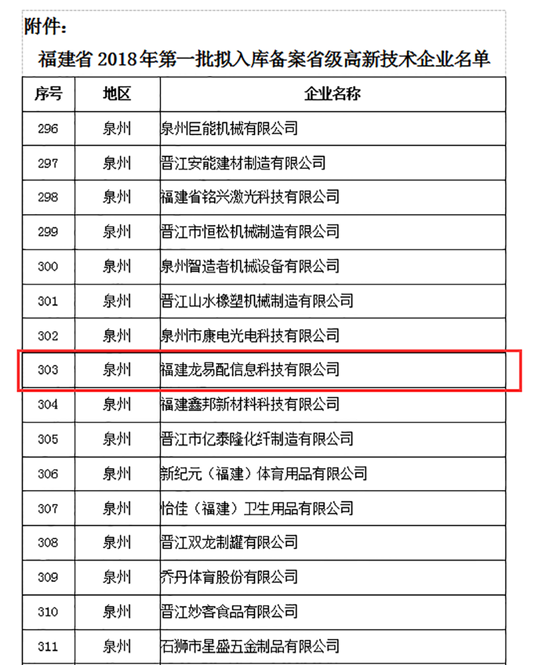 2018年11月30日,根据国家高新技术企业认定管理办法,福建龙易配信息科技有限公司凭借强大的技术研发实力和持续的创新能力,经过层层严格评审,顺利通过了国家高新技术企业资格审核,正式迈入国家高新技术企业行列。