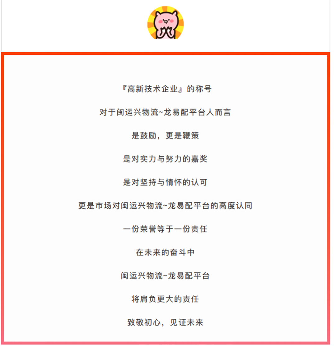 此次获得国家高新技术企业认定,不仅意味着公司资质强,也标志着公司将以更高的要求和标准持续经营,这既是对闽运兴物流~龙易配平台创新能力和核心竞争力的充分肯定,也为闽运兴物流~龙易配平台未来的长足发展奠定更为坚实的基础。